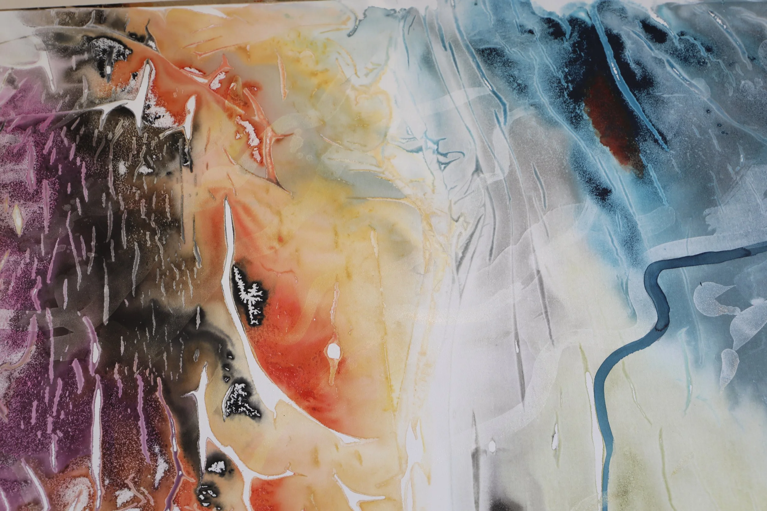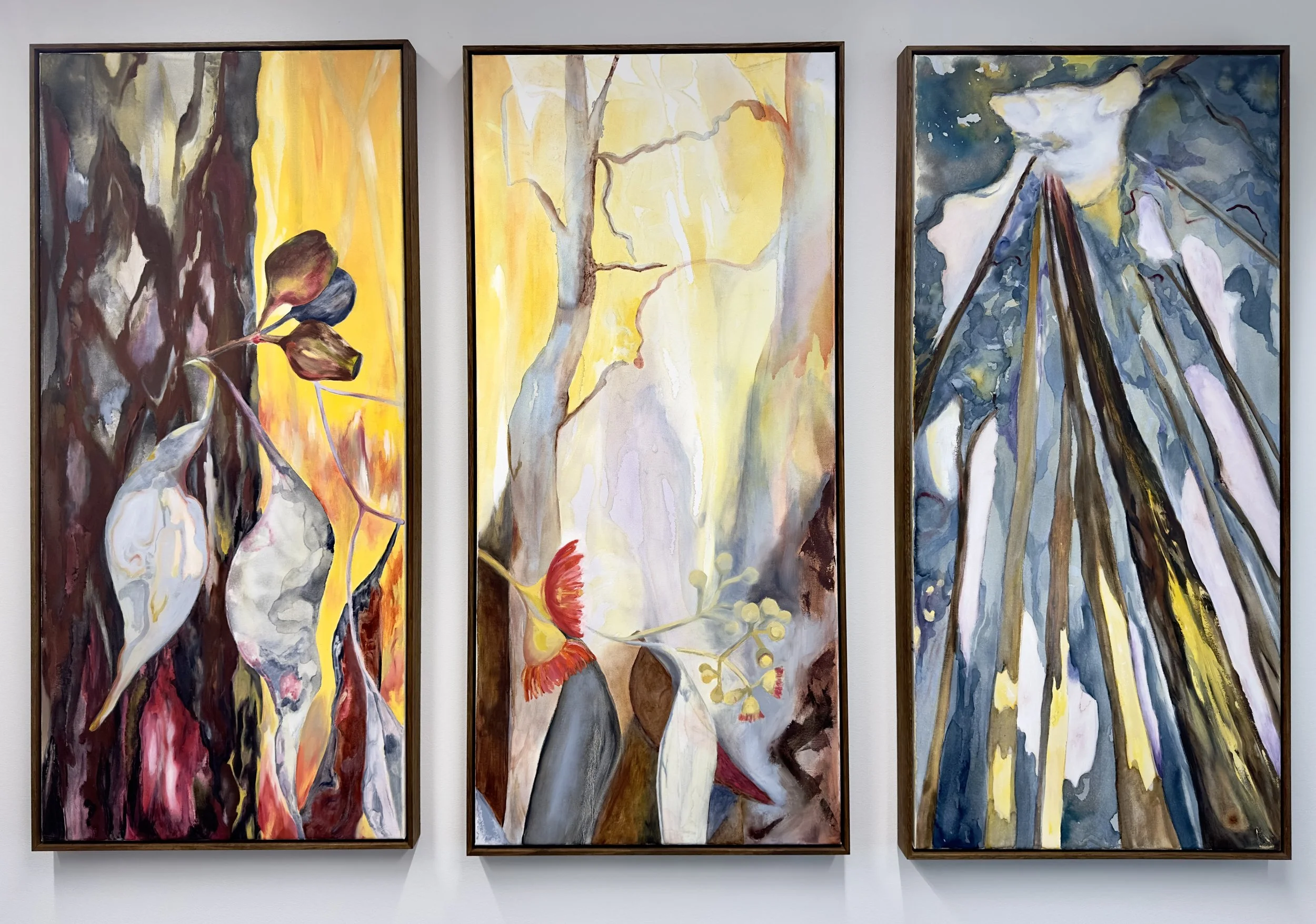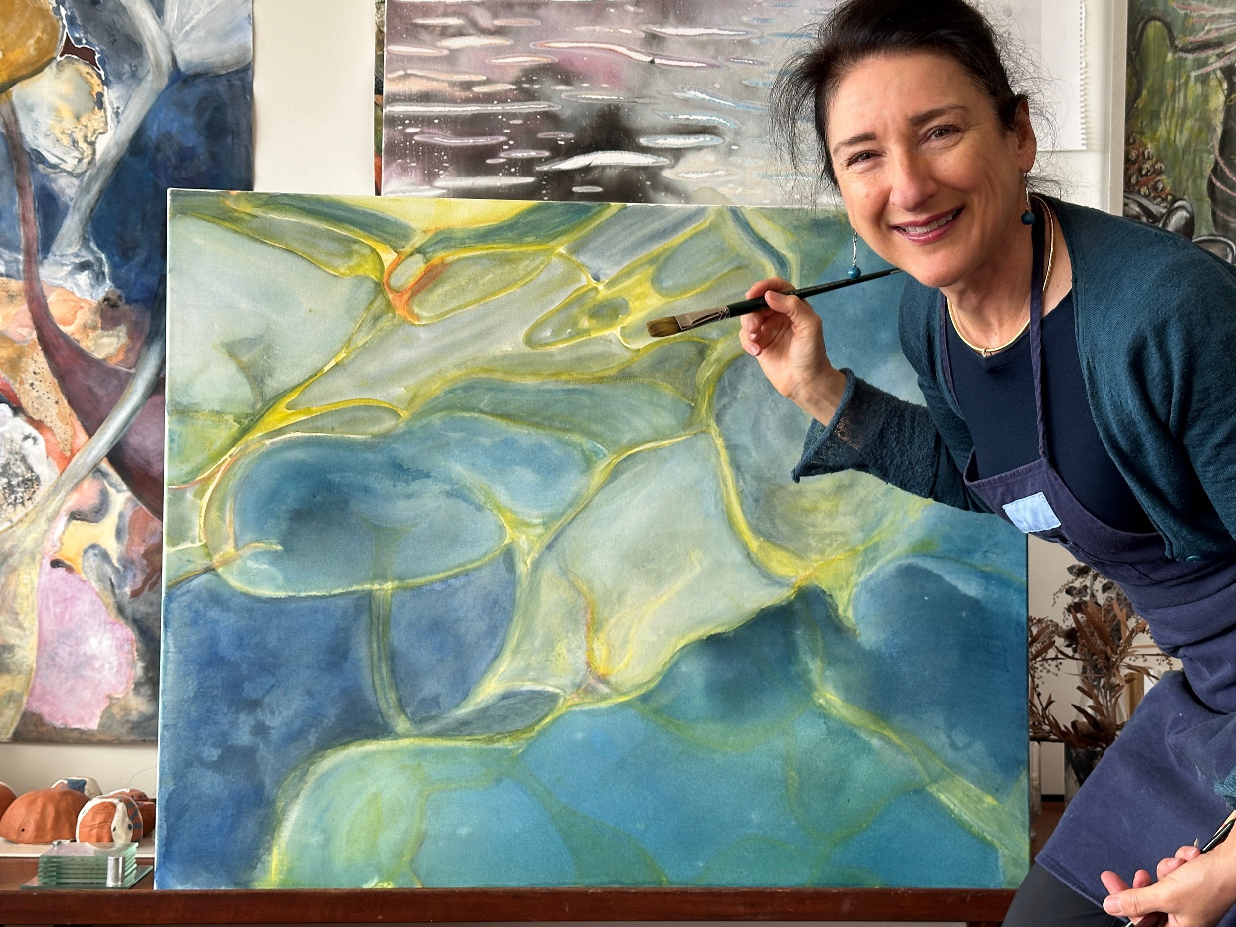 Working in Birrabirragal, Bidjigal and Gadigal country, I explore the rhythms and patterns of a wild, coastal world, both above and below the waves. It is a world of swiftly changing moods, of ancient weathered cliffs, of oddly elegant flora and sea creatures, all slanted through with shifting sunlight. I create abstract landscape works that capture the sense of us moving through our environment. For me that involves a kaleidoscopic view, a sort of surround sound sense of looking everywhere at once. As an ocean swimmer, I see the landscape from a moving viewpoint above a world with no horizon. However even when we’re not in the ocean, we don’t see the world from a static perspective - we are constantly looking around and shifting our viewpoint. As I’m walking in the Australian bush, my gaze shifts from soaring cliffs to the lichen patterns on rocks beneath my feet, from sun dappling shadows on tree trunks to pebbles in burbling creeks.