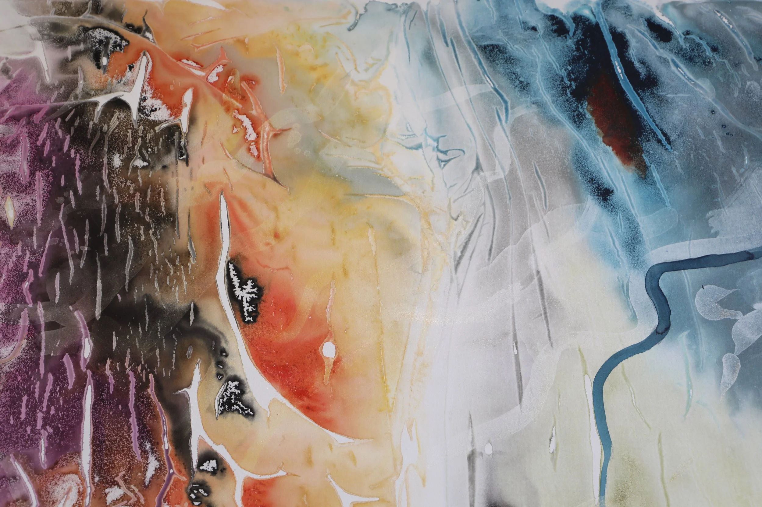 I created the very large works in a massive courtyard in the National Art School, laying the canvas on the ground, pouring pigments and inks and imprinting various materials. In this collection, A World With No Horizon, I want to convey the swimmer’s feeling of being absorbed into an elemental force of nature and rather than being overwhelmed by it or needing to control this natural force, having its power infuse into you.